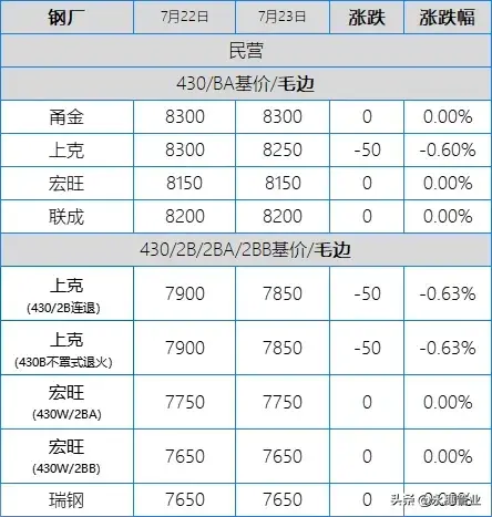 目前市場(chǎng)主流報(bào)價(jià):410S熱軋黑皮在6100-6150元/噸;430熱軋黑皮在6700-6800元/噸;太鋼/酒鋼430/2B(毛)在7850-7950元/噸;聯(lián)眾430/2BA(毛)在7700-7800元/噸;宏旺430/2BA(毛)在7700-7800元/噸;甬金430/BA(毛)在8300元/噸左右;上克430/BA(毛)在8250元/噸左右;宏旺430/BA(毛)在8100-8200元/噸;瑞鋼430/2BA(毛)在7650-7700元/噸,其中期貨價(jià)在7800元/噸左右;聯(lián)成430/BA(毛)在8200元/噸左右。