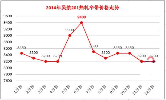 在國(guó)內(nèi)所有生產(chǎn)不銹鋼熱軋窄帶的民營(yíng)鋼廠當(dāng)中,主要的鋼種是201。以吳航201熱軋高銅料為例,價(jià)格在6月份達(dá)到了全年的頂峰,為 9400元/噸。隨后出現(xiàn)下滑,后停留在8200元/噸,為2014年畫上了句號(hào)。其中,2014年吳航201熱軋窄帶價(jià)格走勢(shì)如下圖所示: