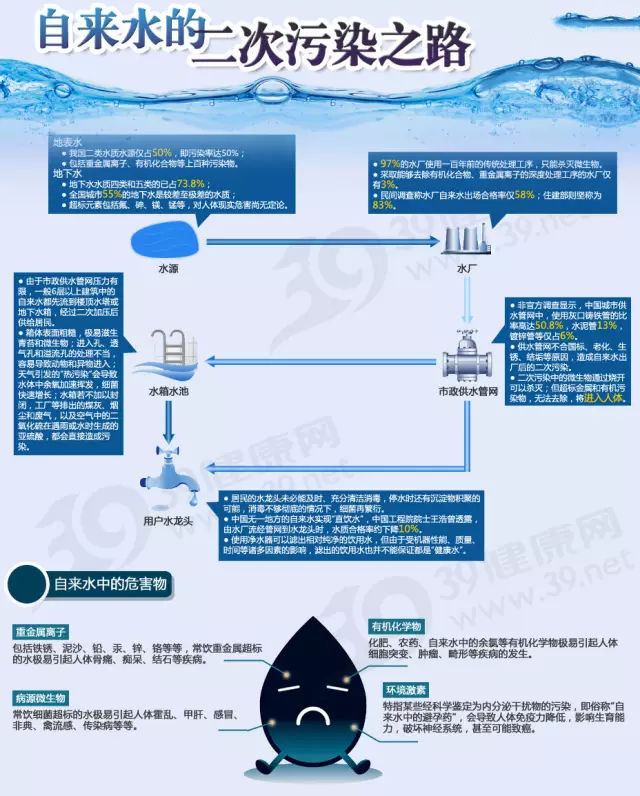 自來水的污染源有很多,其中大的污染源來源于二次供水,如果您是住在高層住宅,每天打開家中的水龍頭時(shí),您是否清楚,水龍頭流出的水其實(shí)并不是由自來水公司直接供給,而是通過小區(qū)的二次供水設(shè)備把設(shè)置在樓頂端蓄水池里的水經(jīng)過加壓后才送到您家的。