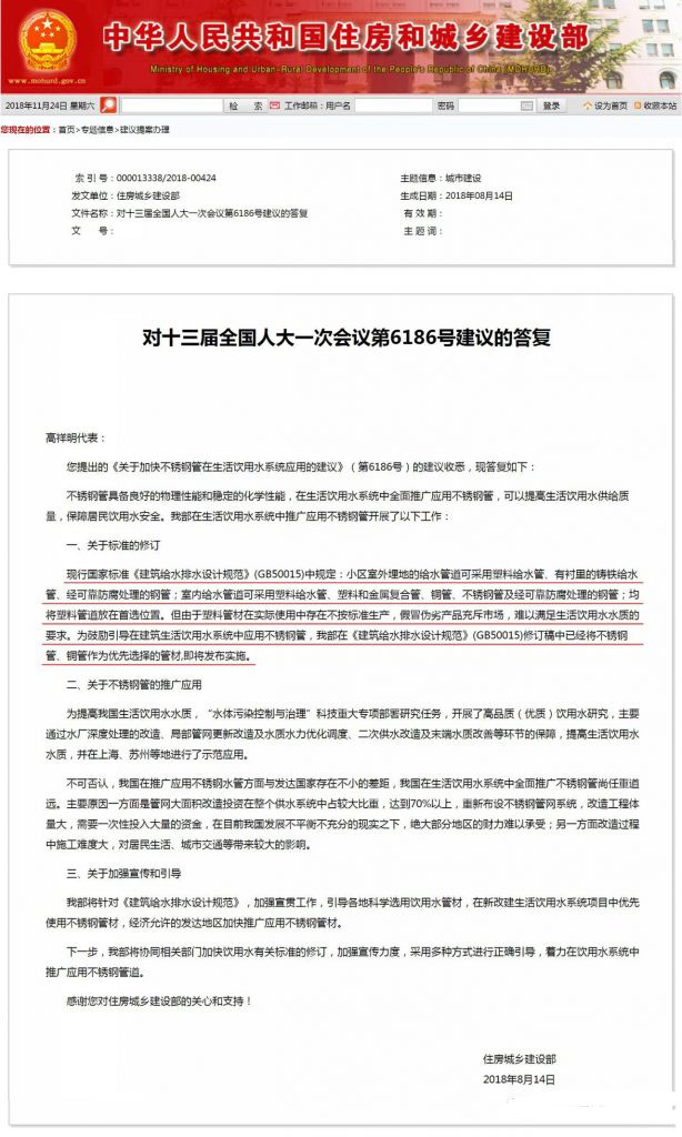 國家住房城鄉(xiāng)建設(shè)部在《對十三屆全國人大一次會議第6186號建議的答復(fù)》中公開表態(tài):為鼓勵引導(dǎo)在建筑生活飲用水系統(tǒng)中應(yīng)用不銹鋼供水管,已在《建筑給水排水設(shè)計規(guī)范》(GB50015)修訂稿中將不銹鋼管、銅管作為優(yōu)先選擇的供水管材,即將發(fā)布實施。